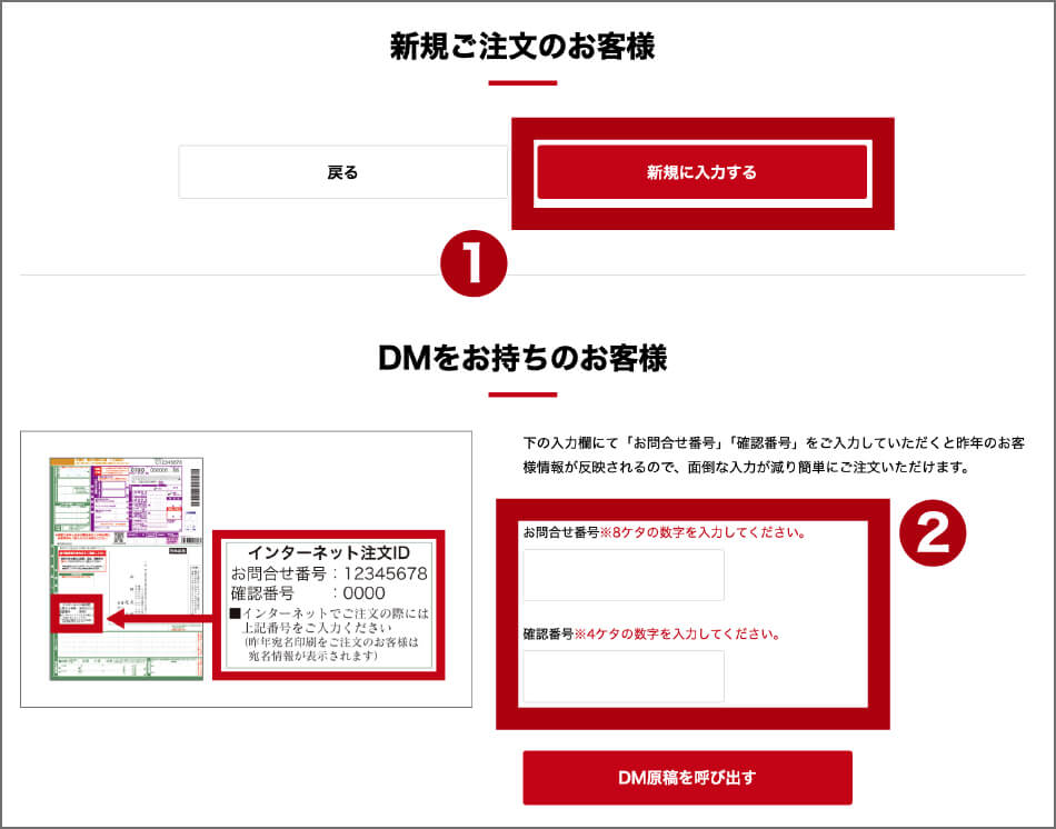 - 2ダイレクトメールをお持ちのお客様は、ダイレクトメール申込書に記載のインターネット注文ID欄のお問合せ番号と確認番号を入力して「DM原稿を呼び出す」ボタンを押してください